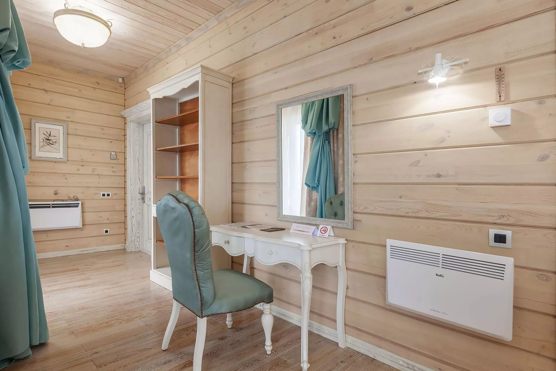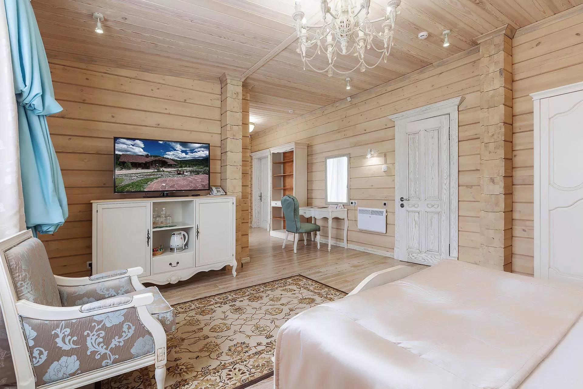 Просторные однокомнатные номера с зоной отдыха расположены в коттеджах из клеёного бруса сосны в духе швейцарского шале или коттеджах из массива кедра.