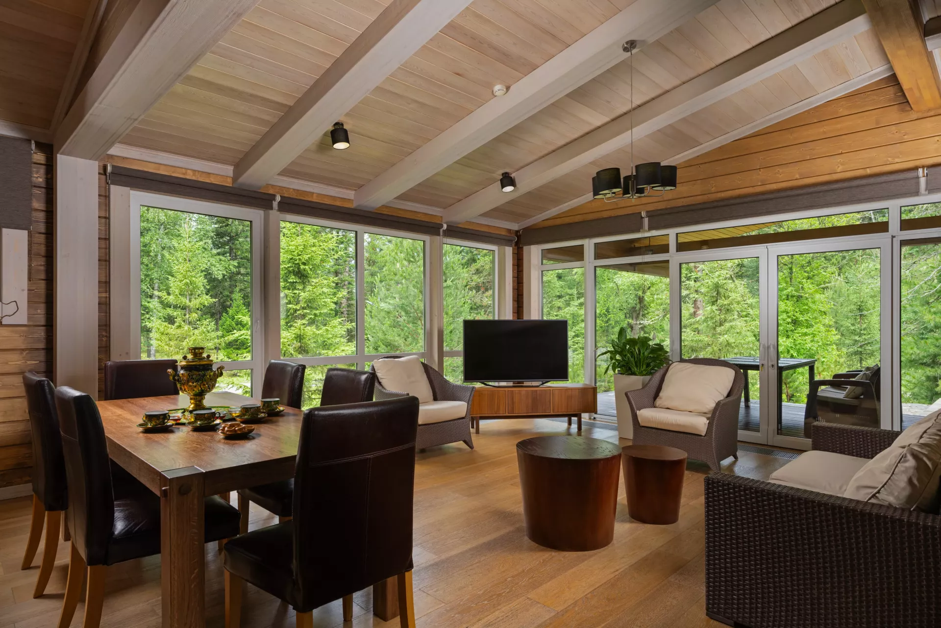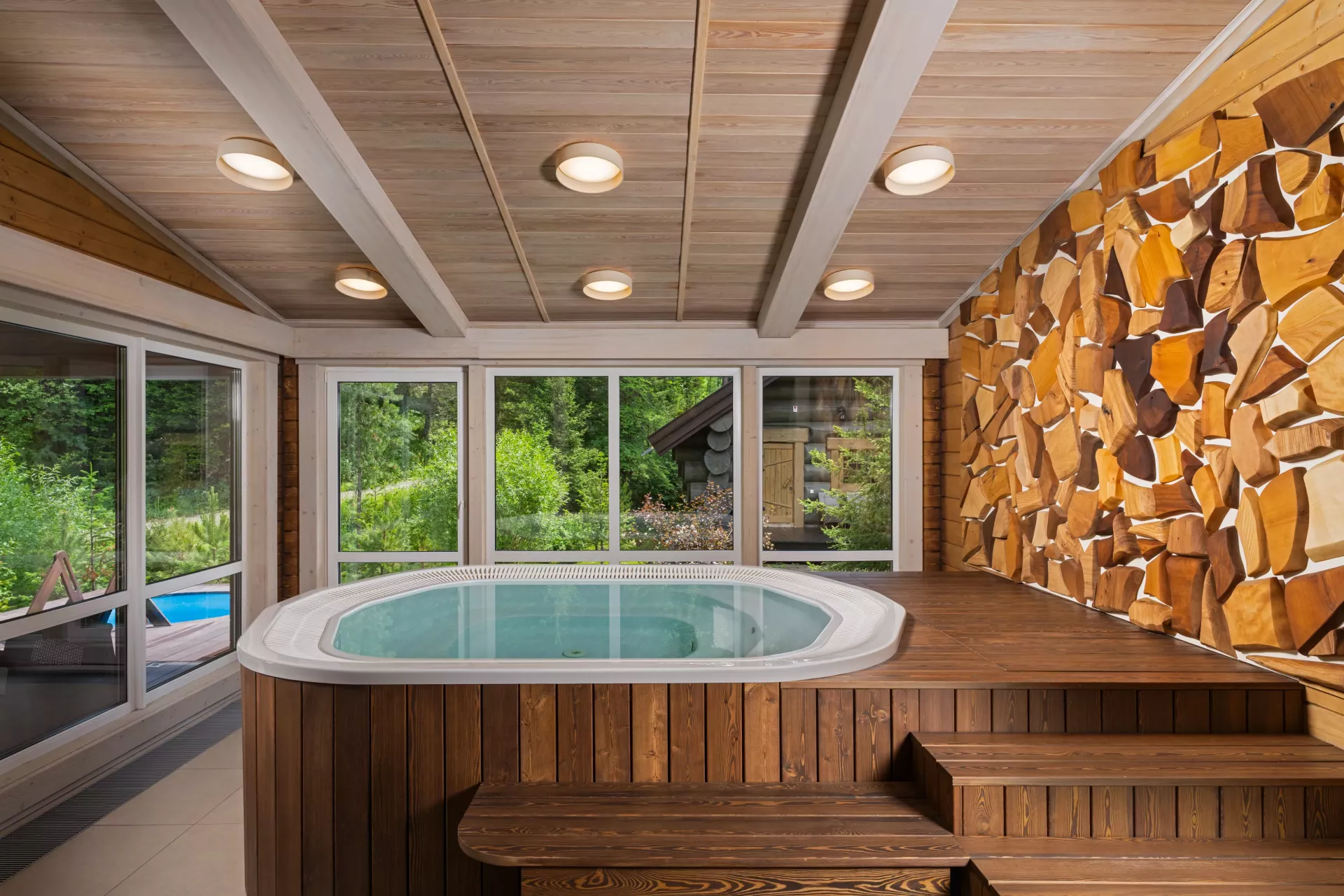 - купелью с панорамными окнами и видом на лес